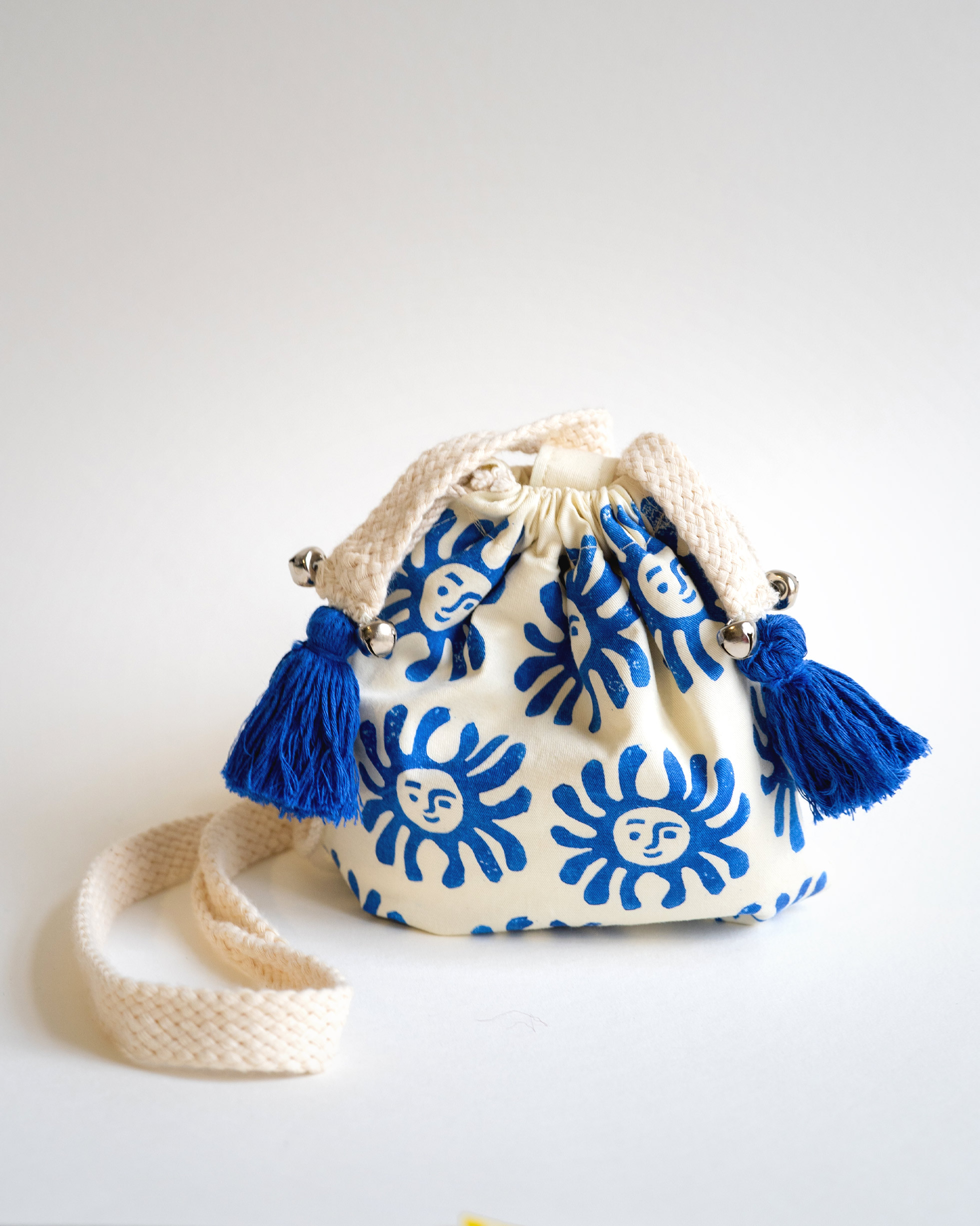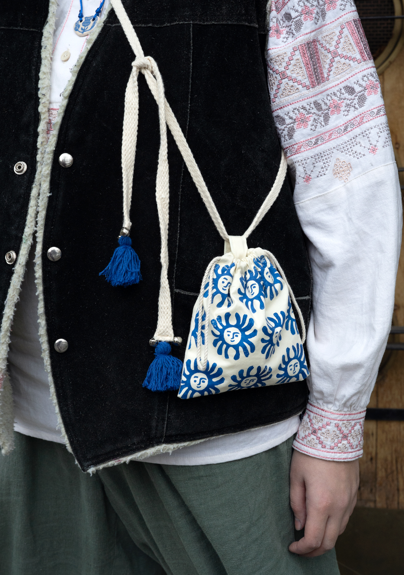 Матеріали мішечка: бавовна з поліестером зовні та фліс усередині. Мішечок оздоблений вибійкою, китицями та металевими дзвониками-шелестами.