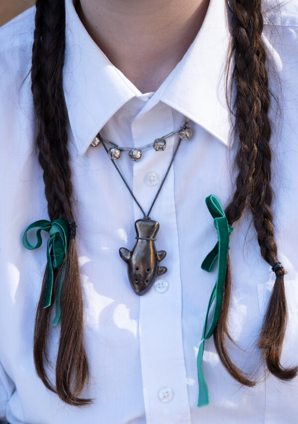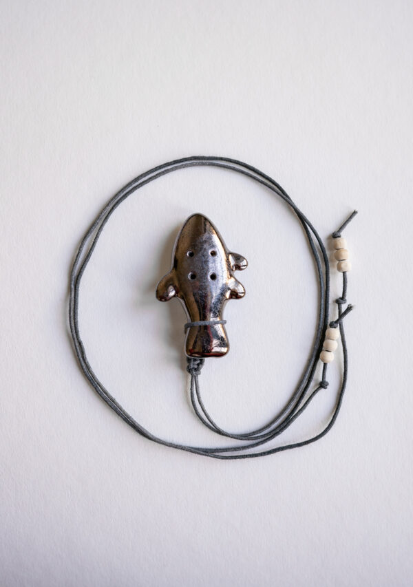 Прикраса та музичний інструмент, цей свищик натхненний давніми українськими народними іграшками. Риба має дзвінкий звук та приємні на дотик текстури. Виліплена вручну з глини, вона доповнить вашу щоденну мандрівку звуком. Має чотири ігрових отвори.