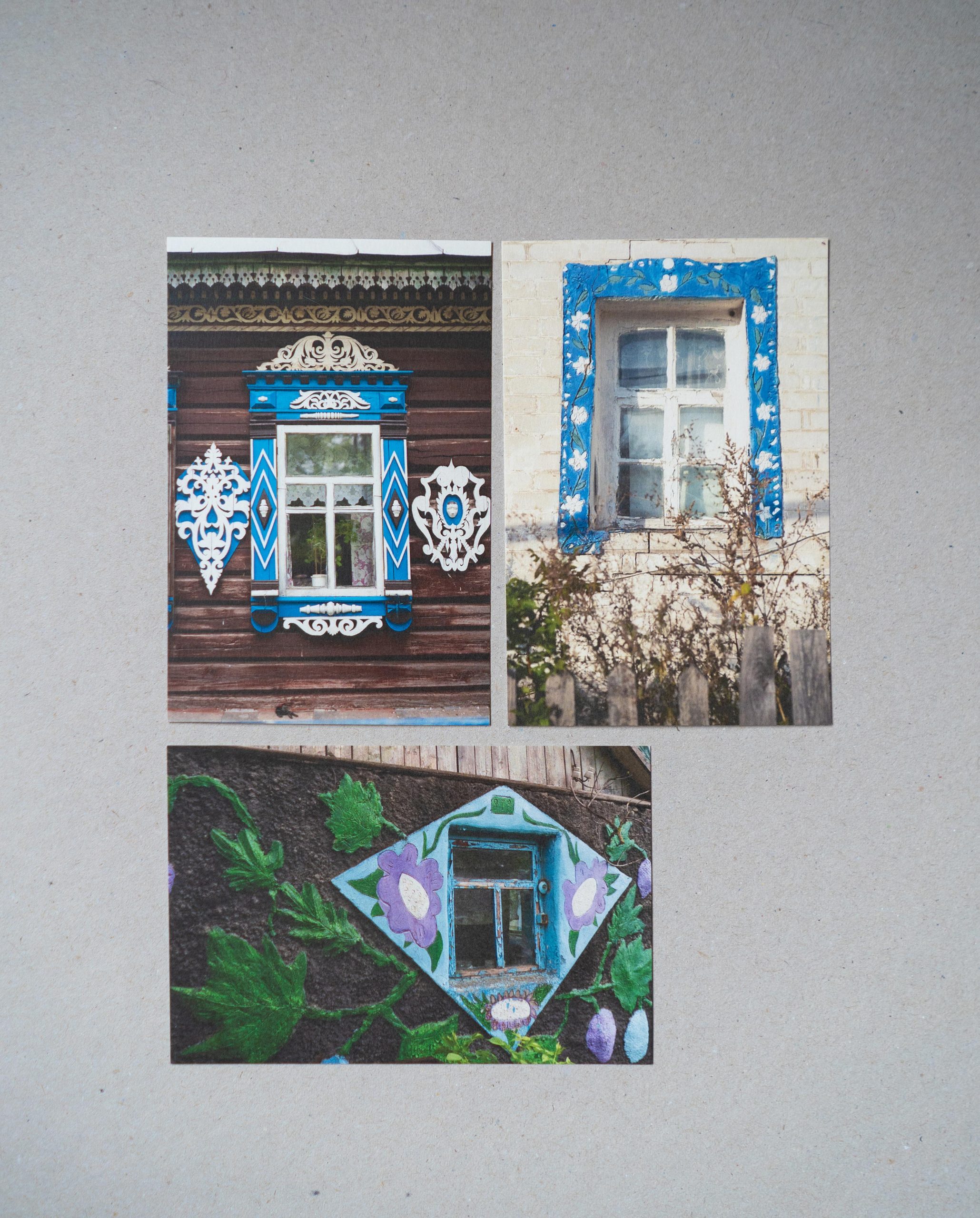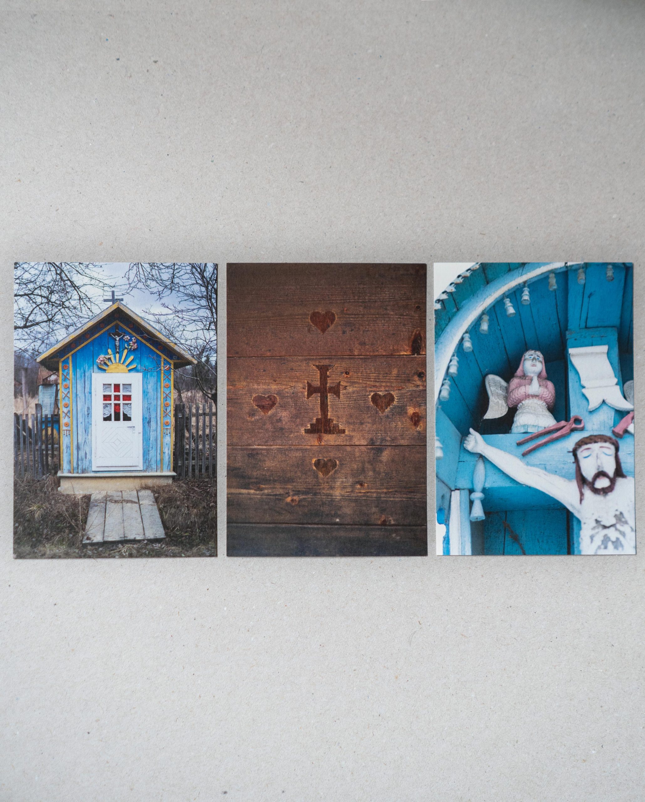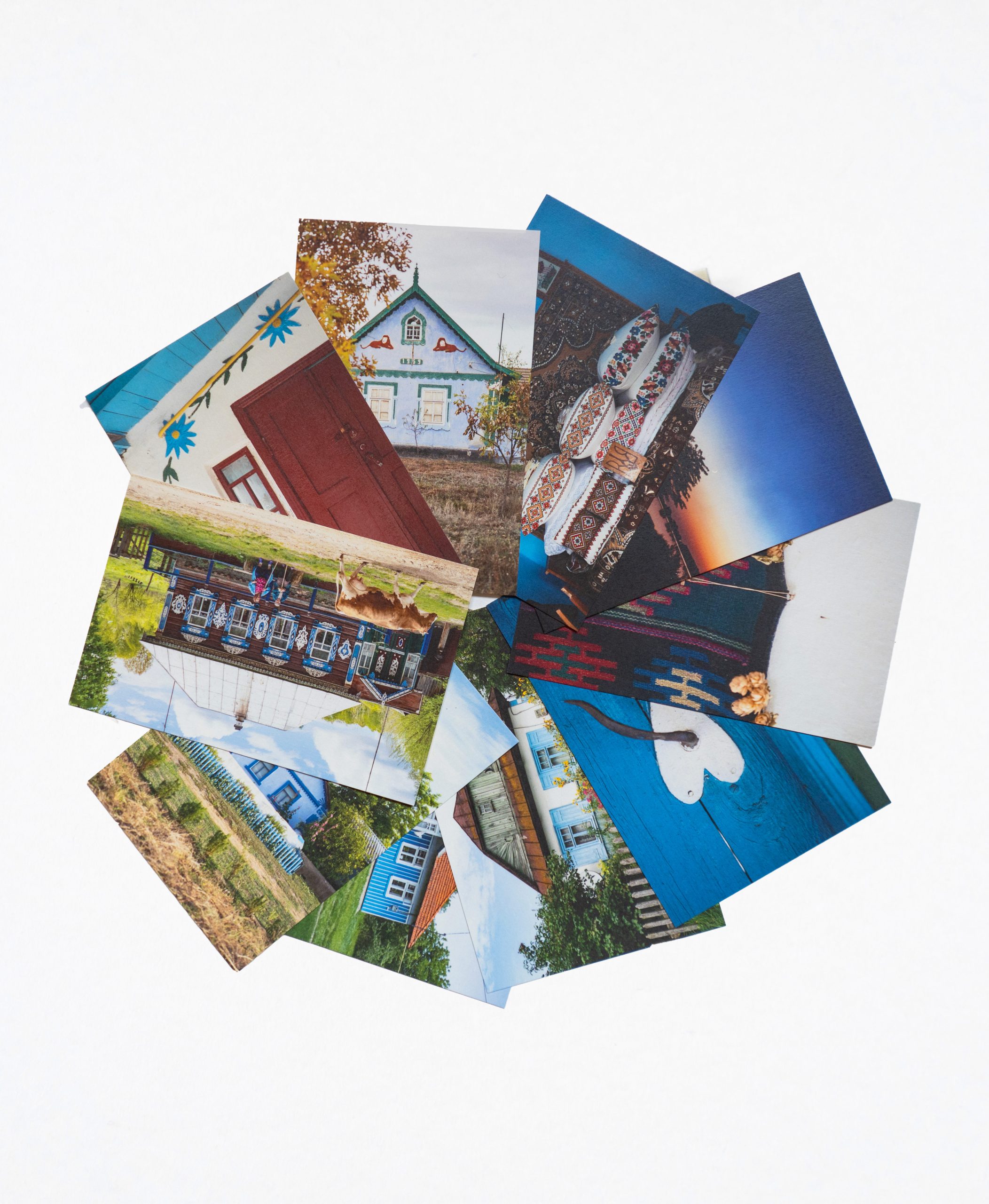 Набір із 20 листівок із фотографіями хат і сакральних об’єктів у сільській місцевості, а також їхніх оздоб.